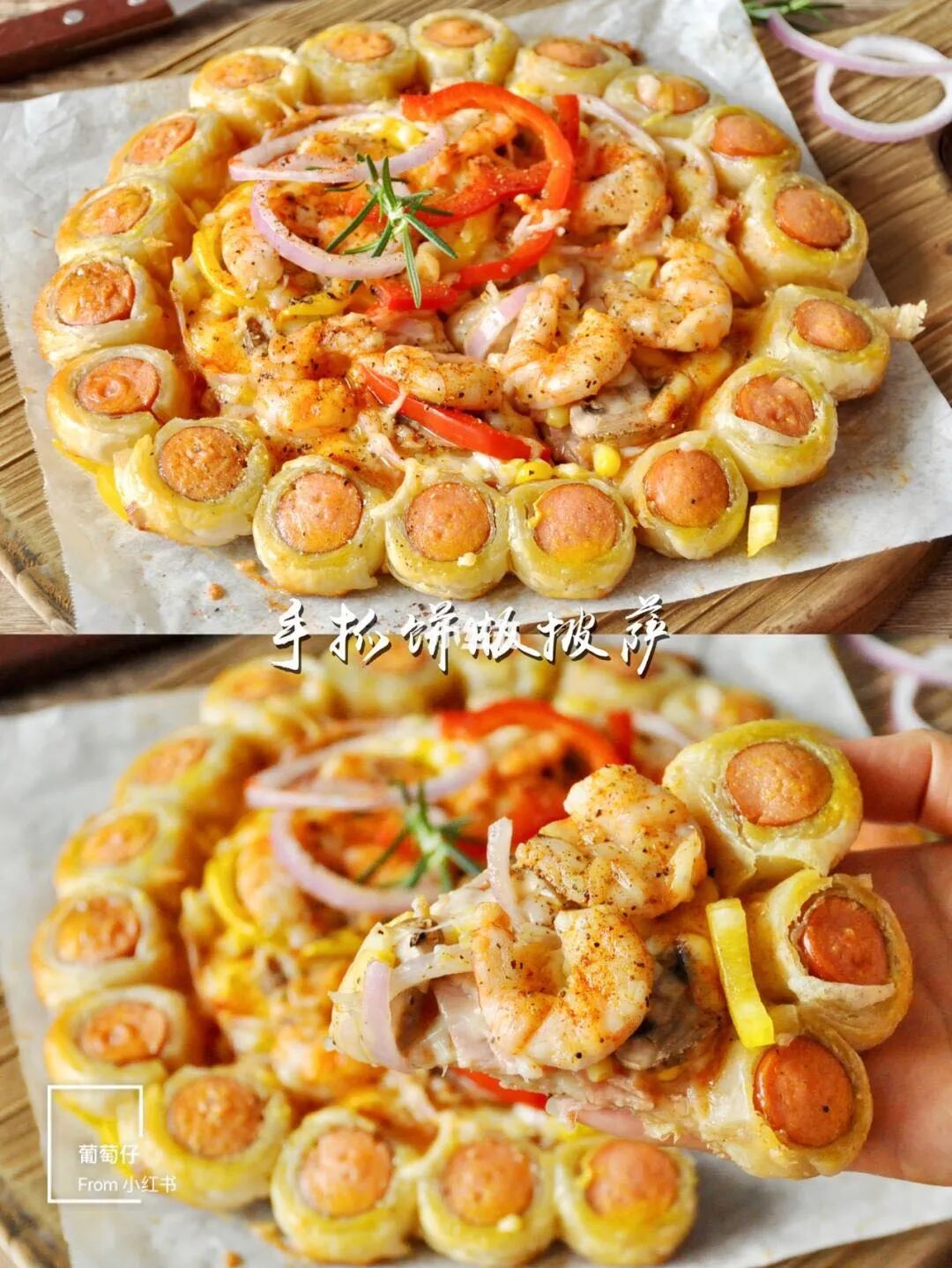 2张手抓饼,白蘑菇,虾,彩椒,洋葱,马苏里拉芝士,培根,玉米粒,香肠。
