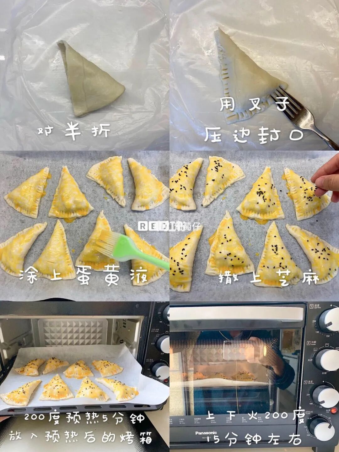 3.表面涂蛋黄液,撒上芝麻,放入200度预热5分钟的烤箱,上下火200度,15分钟表面焦黄后即可。