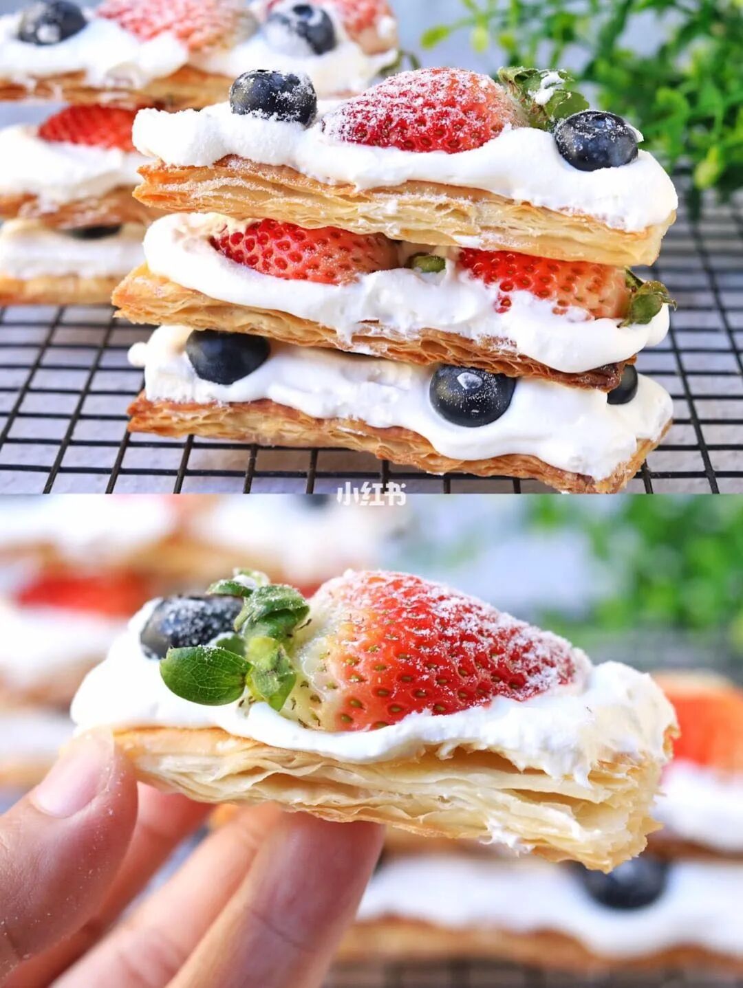 3.淡奶油加糖打发,酥皮挤上奶油,放上水果,依次叠加做三层,筛上糖粉装饰即可~