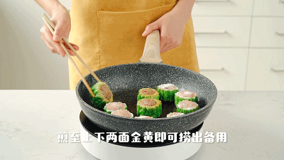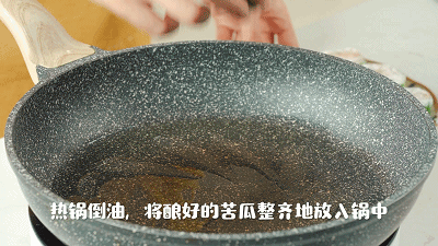 我这里呢,没有直接把酿苦瓜放进锅里焖煮收汁。在这之前,还稍微煎了一下。这样既有利于肉馅定型,吃起来还会更香。