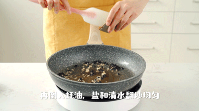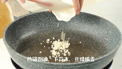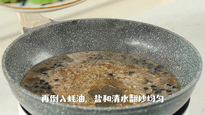 8. 热锅倒油,下蒜末、豆豉煸香后,加入蚝油、盐和清水翻炒均匀,煮至稍稍浓稠状