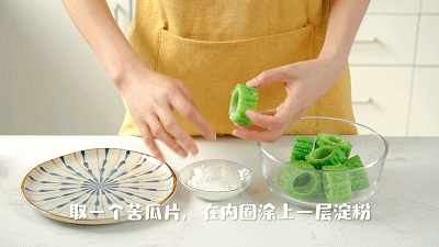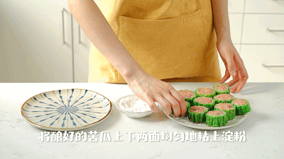 6. 将酿好的苦瓜上下两面均匀地沾上淀粉