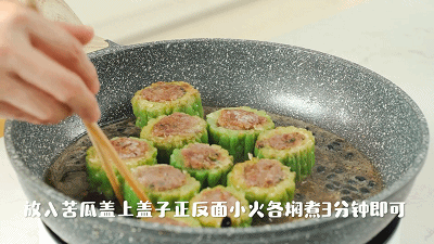 9. 倒入第7步煎好的苦瓜,盖上盖子,用小火将其正反面各焖煮3分钟即可