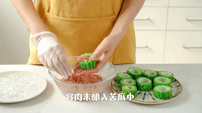 5. 在苦瓜内圈涂上一层淀粉,然后将肉馅酿入其中
