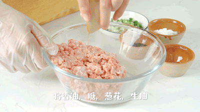 4. 猪肉末中加入香油、糖、生抽、淀粉和葱花,用手抓匀,放一旁备用