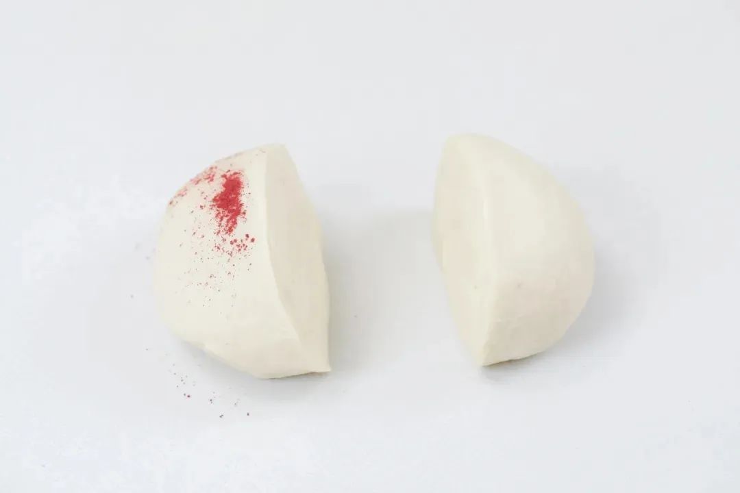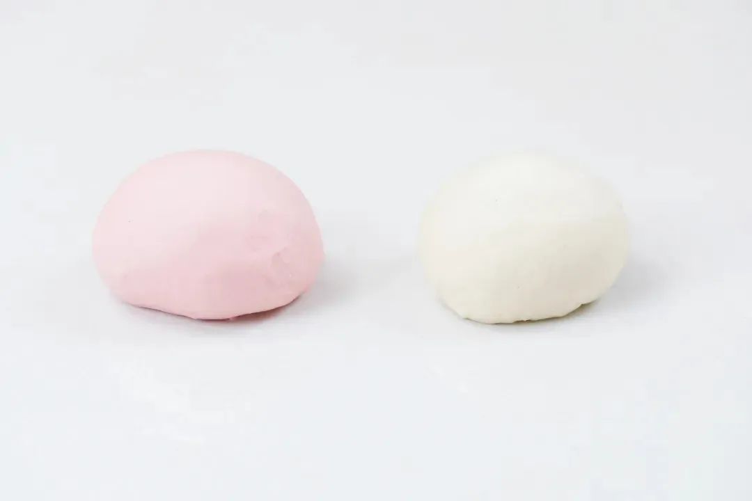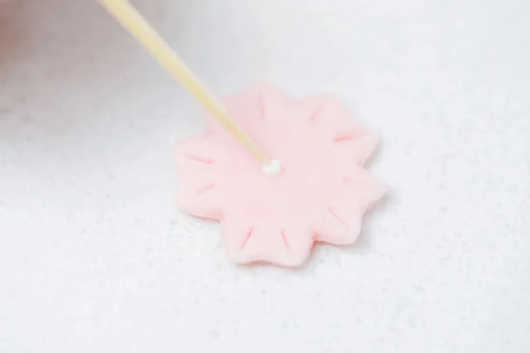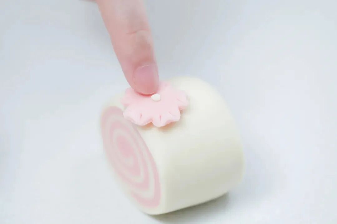 19、在樱花底部抹点水,把樱花黏在馒头上。