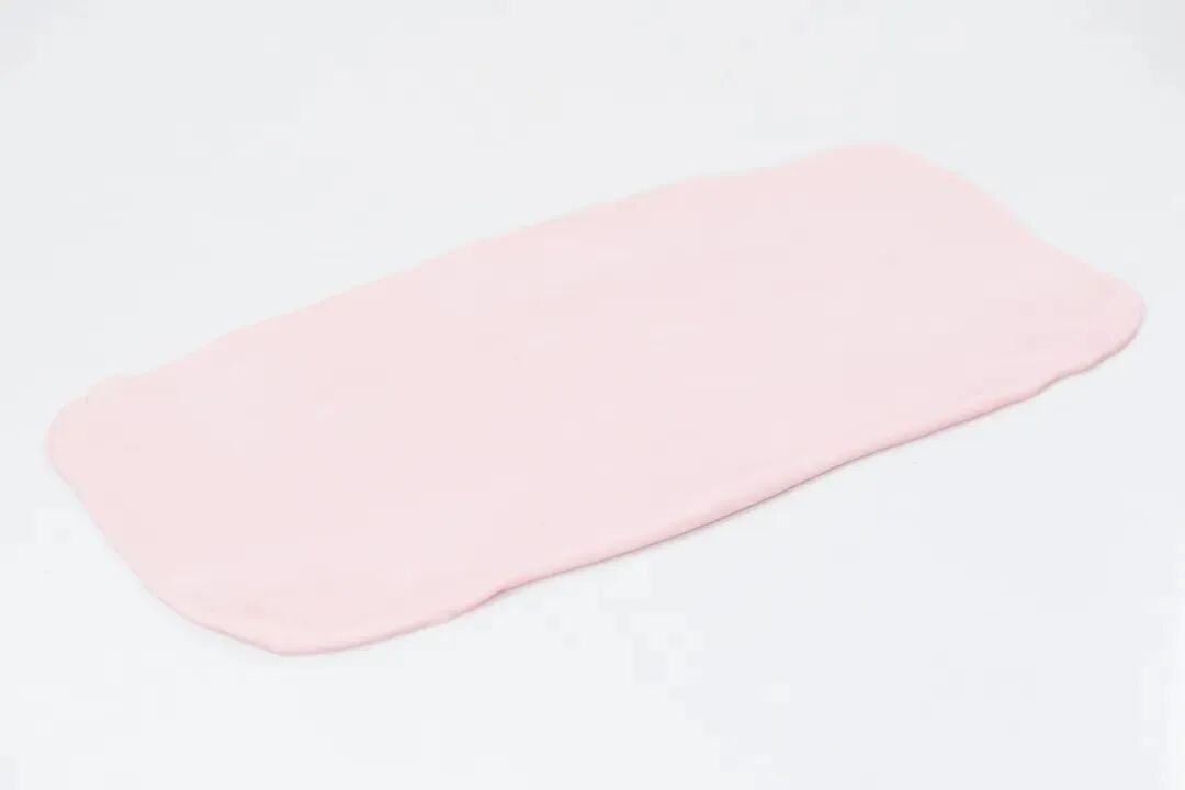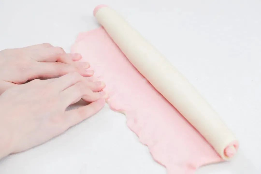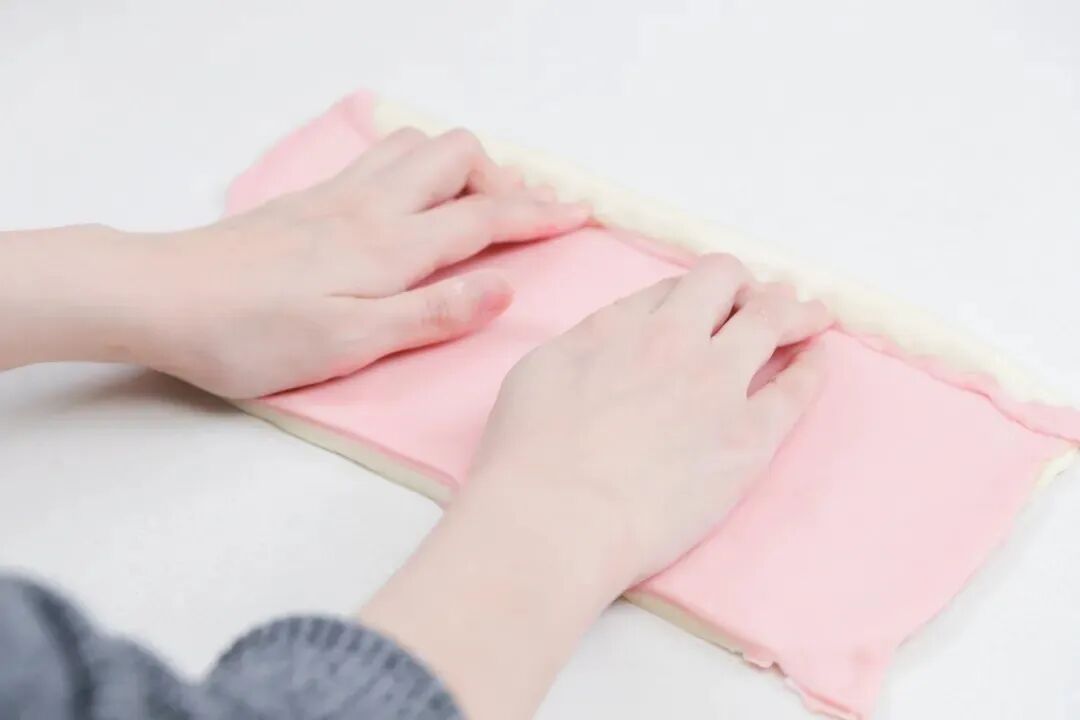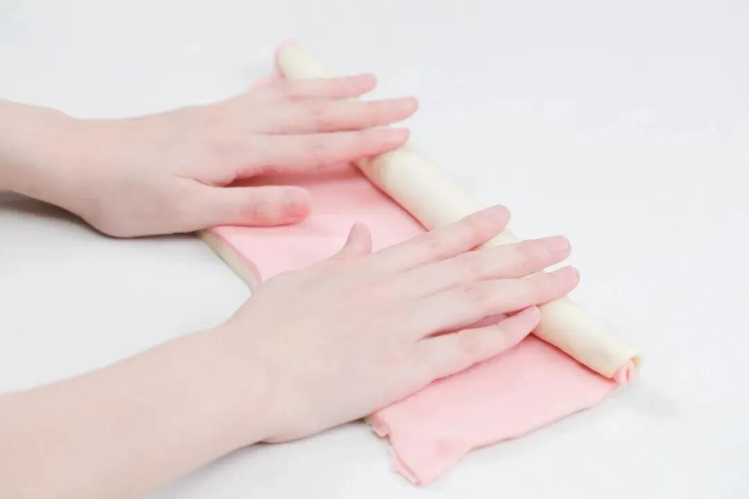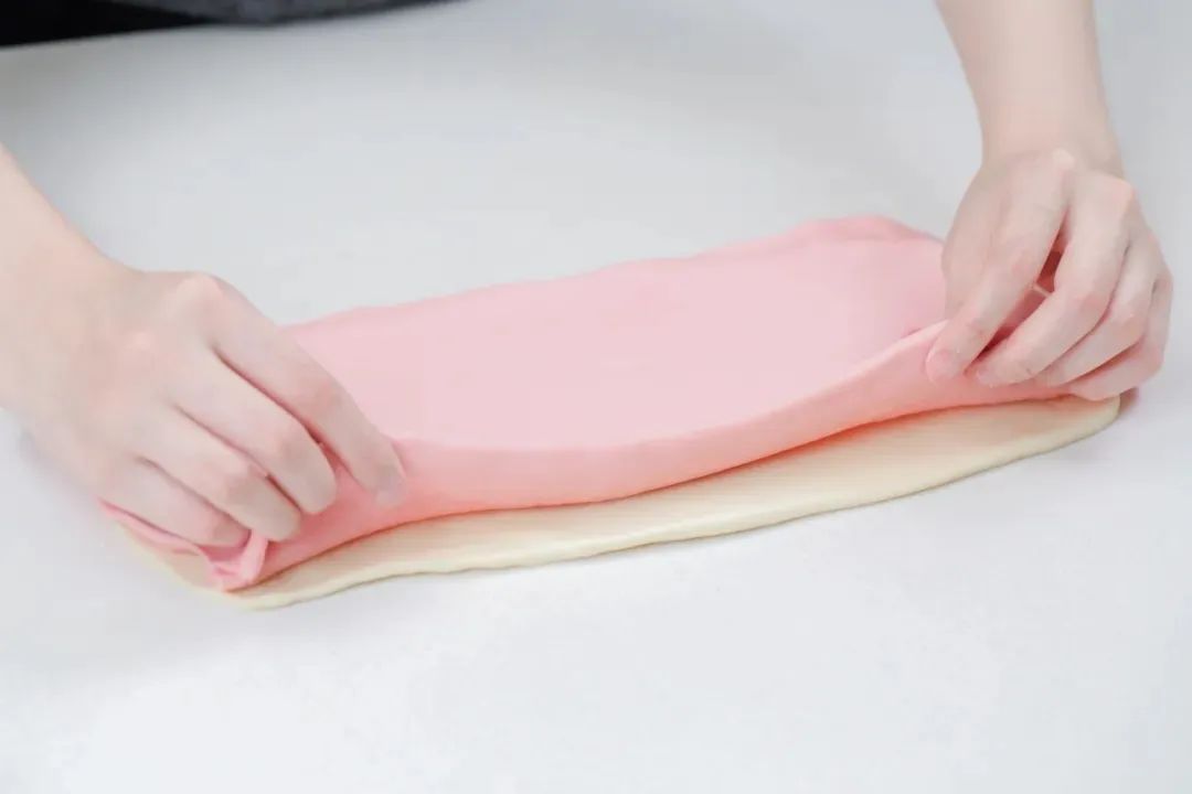 8、白色面皮在底部,粉红面皮铺在上面,然后用刀将四边裁平。裁下的边角料先不要丢,最后还要做樱花造型。