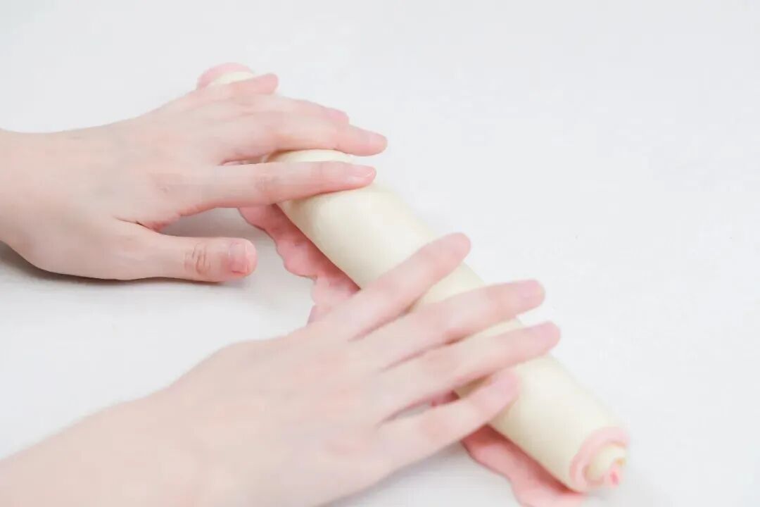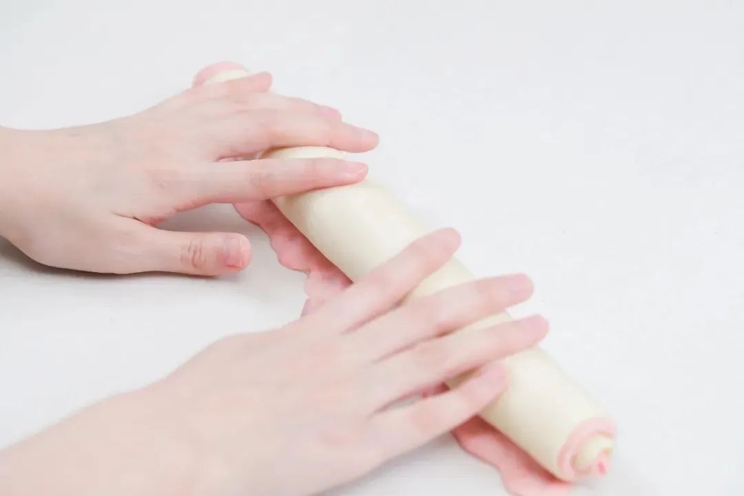 12、最终将面团完全卷起,注意检查底部收口是否平整黏紧。