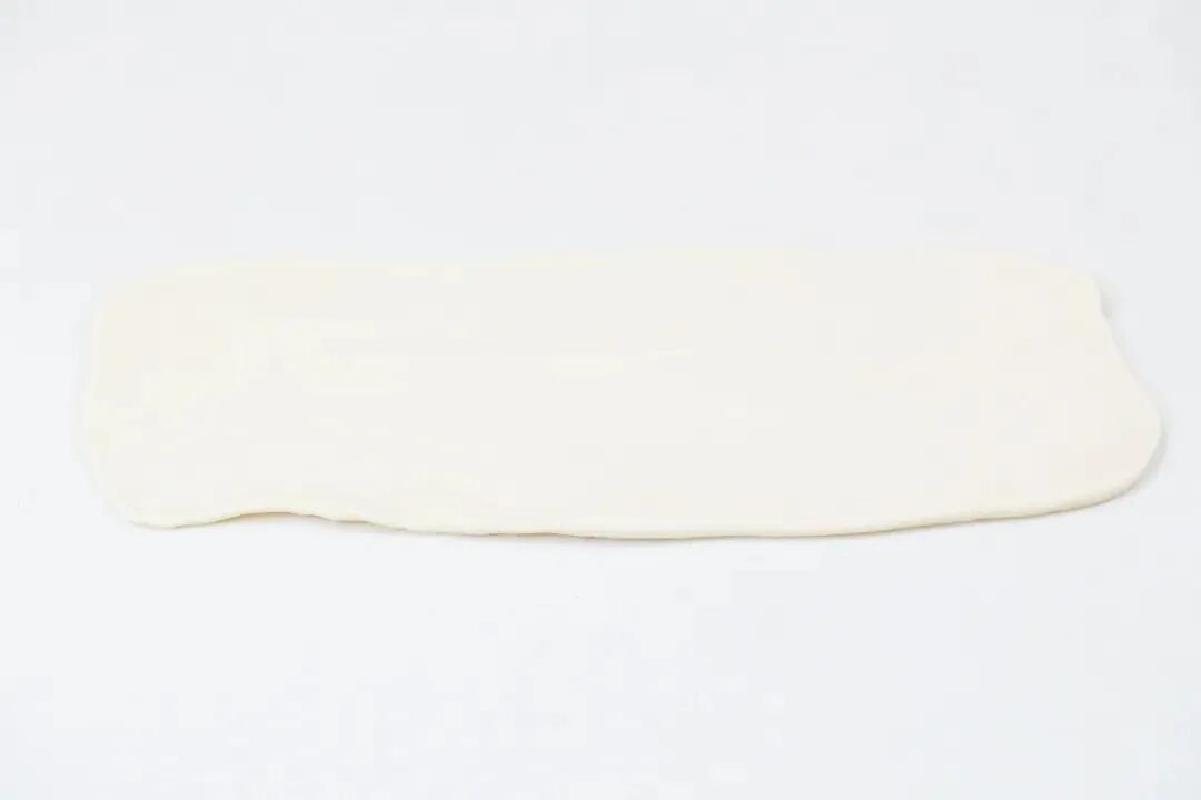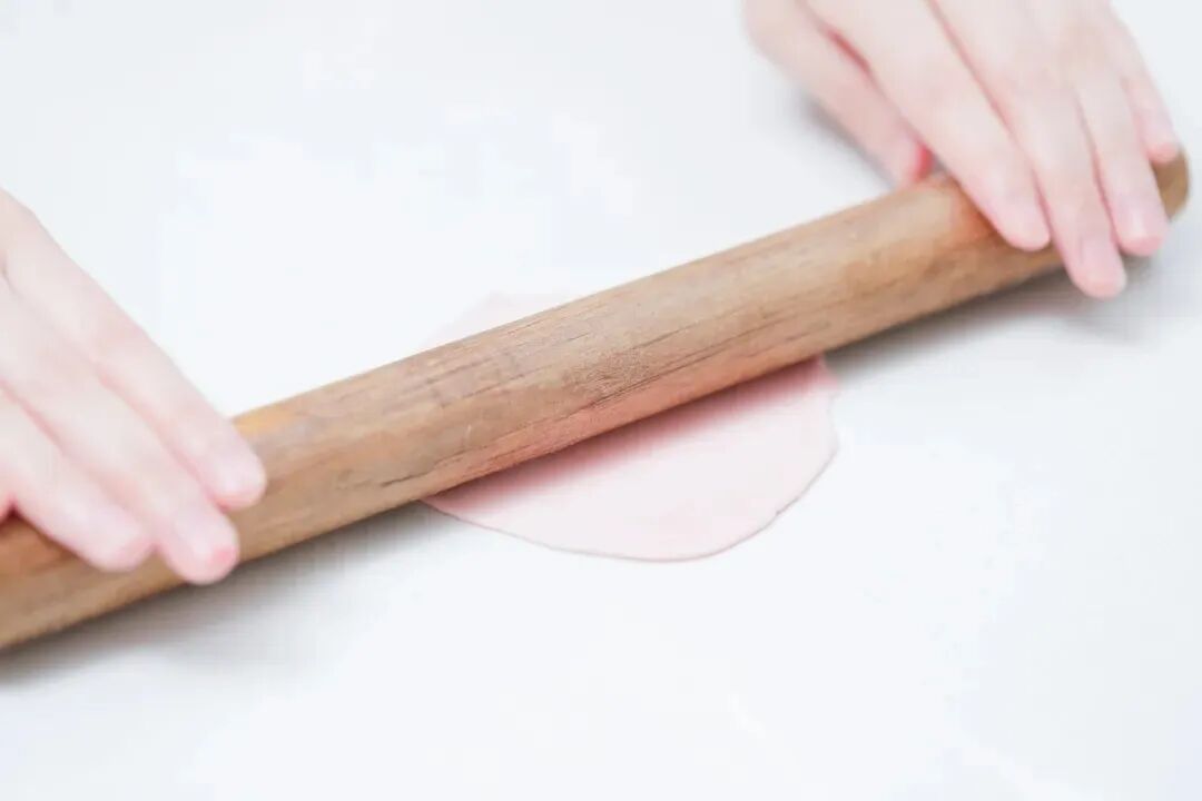 14、将步骤8裁下来红色边角料,揉圆后擀薄成0.2cm的面皮。