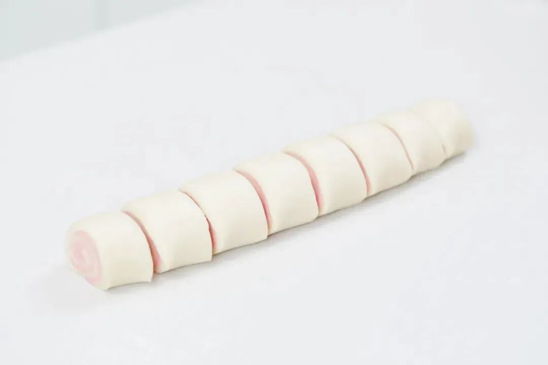 13、收口朝下,切掉不整齐的两端,按4cm间隔切胚。