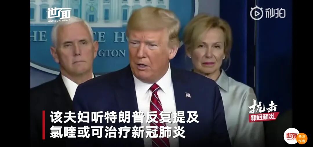 美国一对夫妇因为听到总统反复说氯喹的功效,为了预防感染新冠病毒,他们误服了含有磷酸氯喹的清洁剂。