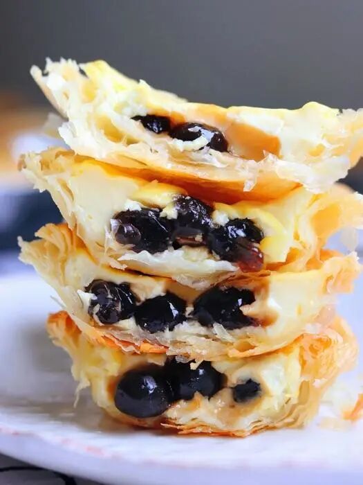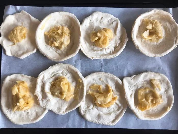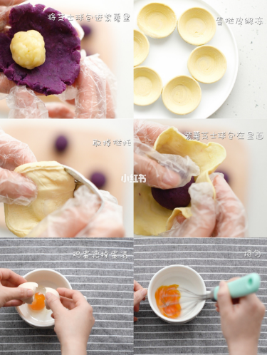 3.拿出提前解冻的蛋挞皮,扒掉挞托,用蛋挞皮包上提前准备好的紫薯芝士馅,再次放进挞托~