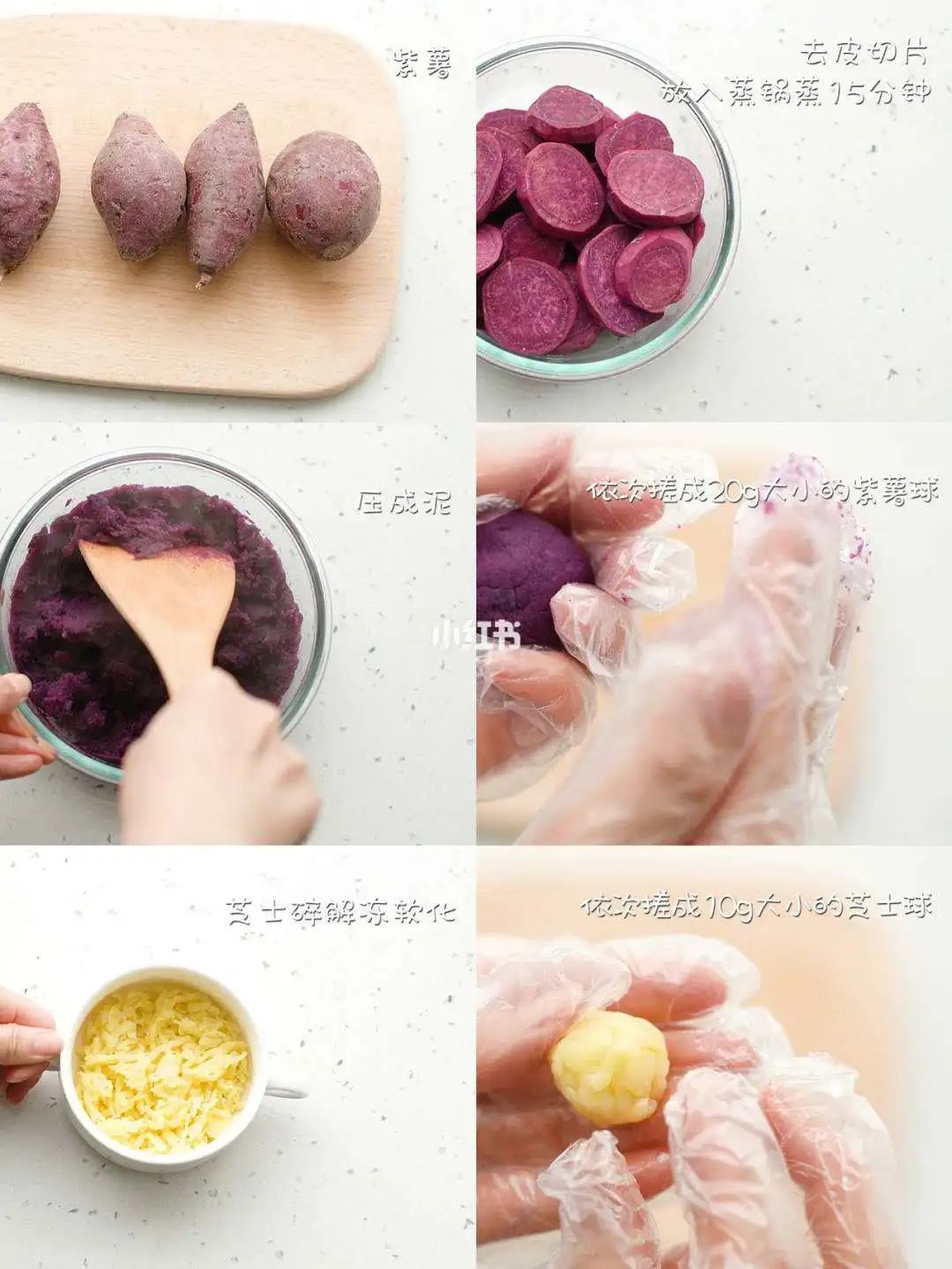 2.紫薯泥和软化后的芝士碎分别搓成一个个球状,紫薯20g,芝士10g,紫薯球压成饼状,依次将芝士球包在紫薯球里备用~