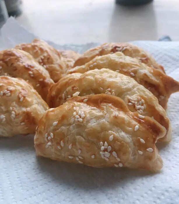 3.适量叉烧丁放入软化后的蛋挞皮中,对半折起捏紧(不能太多,不然烤的时候会爆开,而且一定要捏紧)然后放在用锡纸包好的烤盘上。