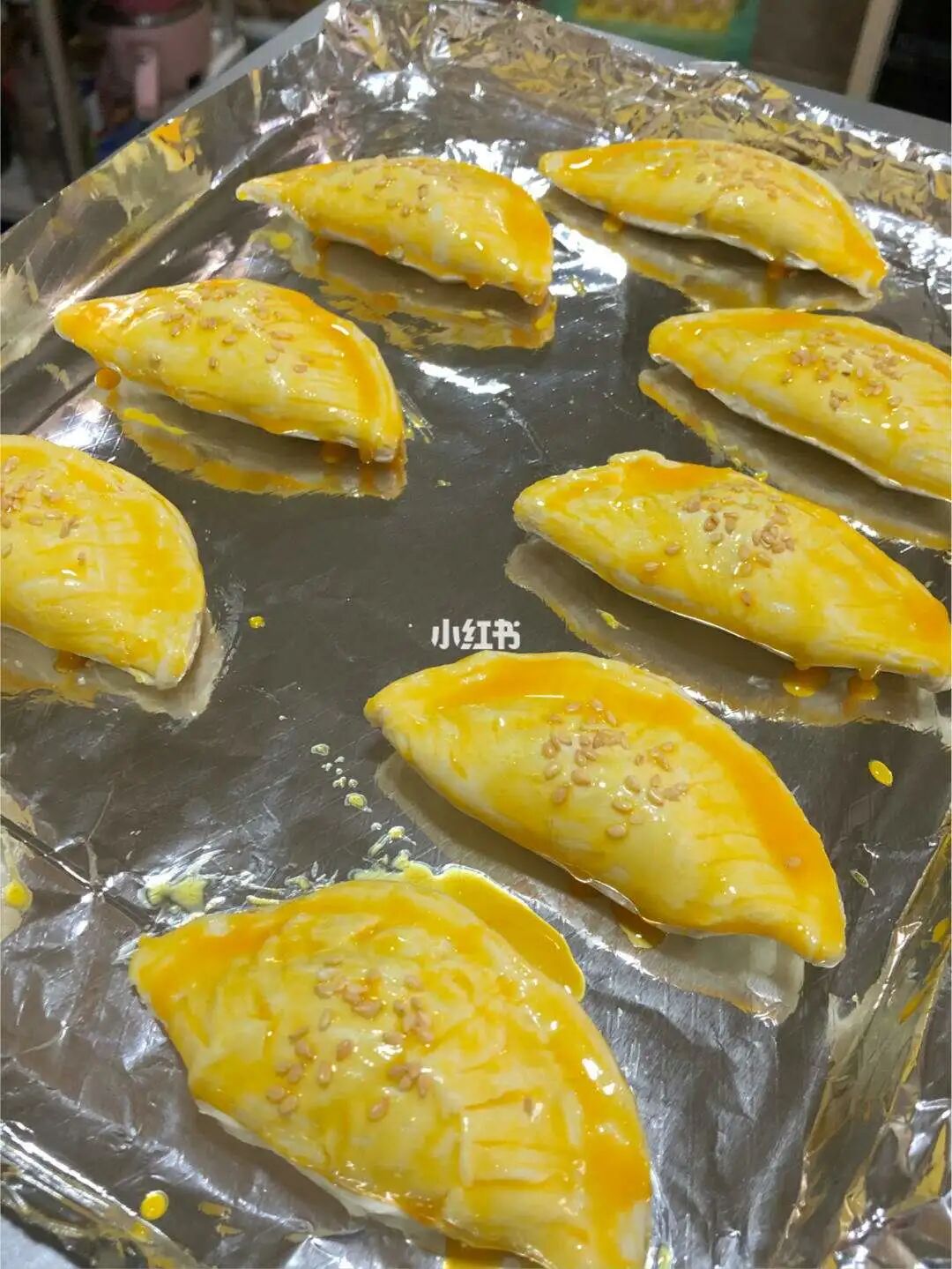 4.捏拢收口底部,表面刷上蛋黄液&黑芝麻。