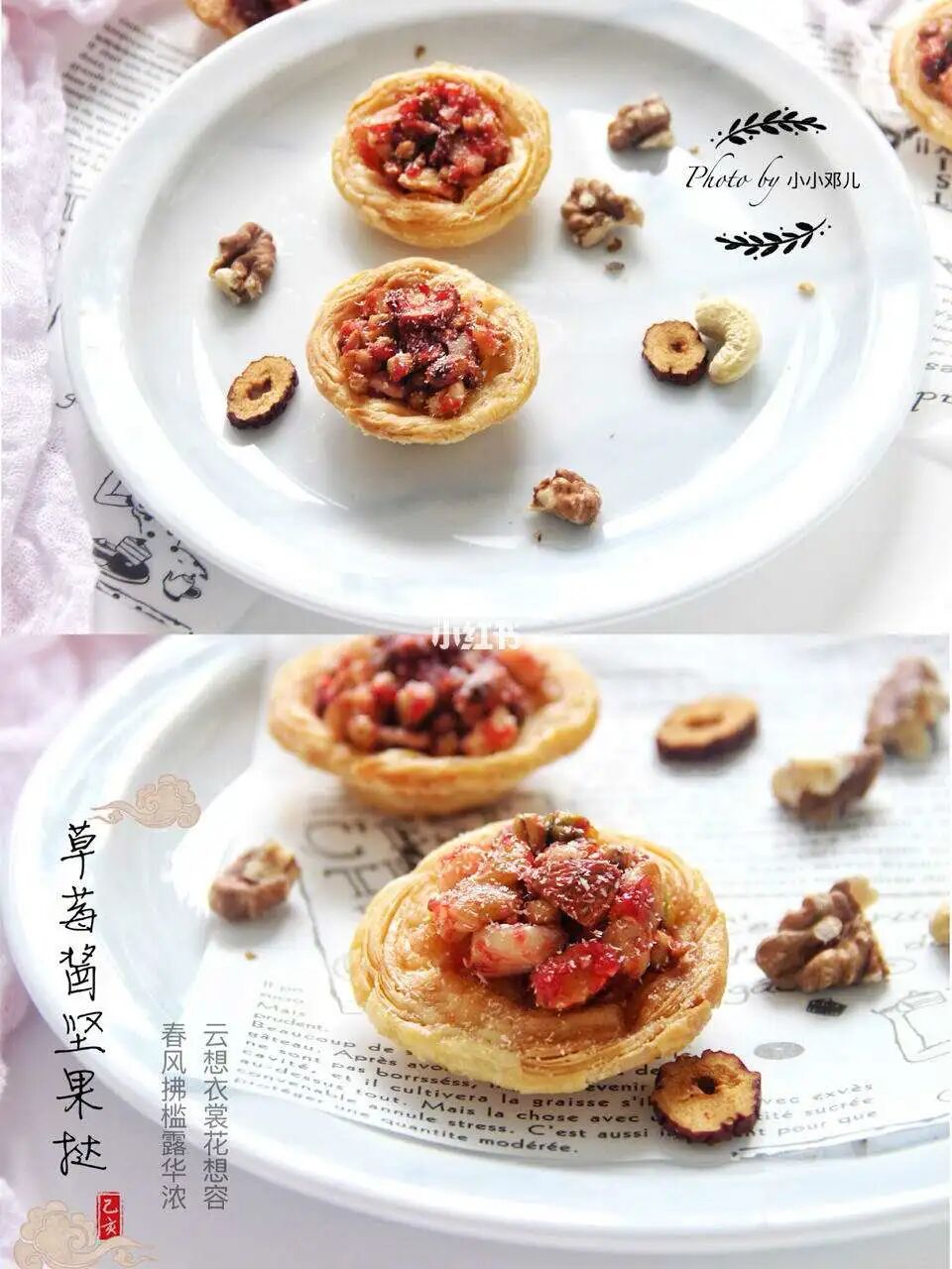 4.蛋挞皮抹上草莓酱,勺子挖上拌好草莓酱的坚果,撒上适量的椰蓉就好啦~