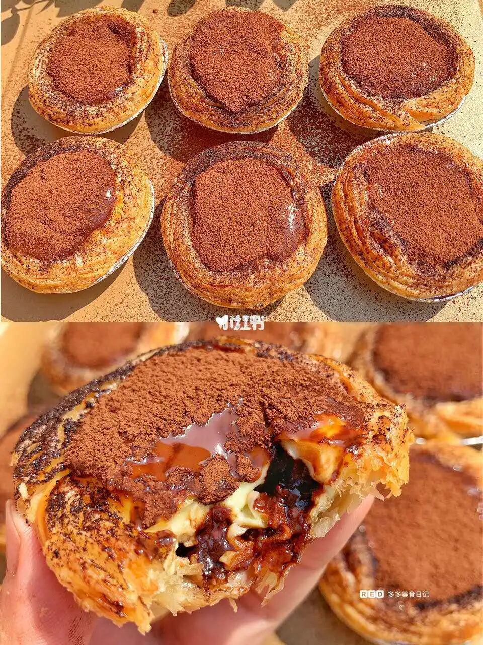 5.融化后倒在烤好的蛋挞上,筛一层可可粉就可以啦。