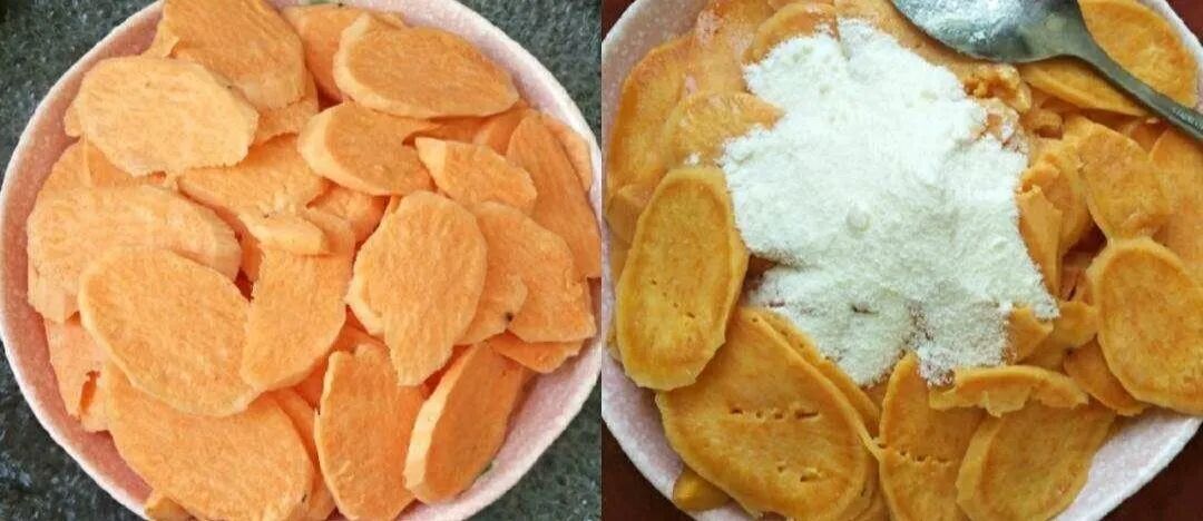 1.紫薯洗净去皮拿到蒸锅里蒸熟后压成紫薯泥(想节省时间可提前将紫薯切片再蒸)。