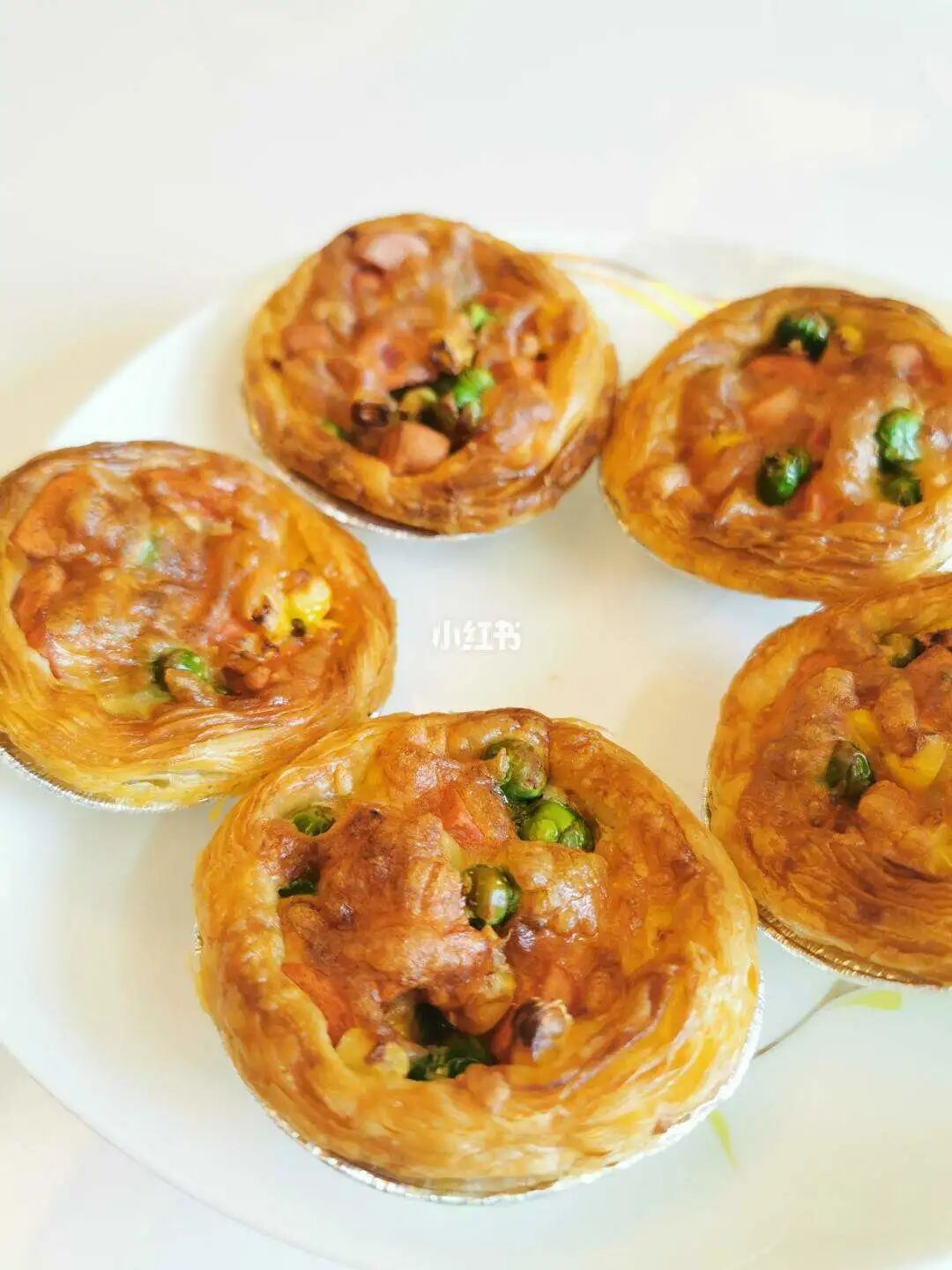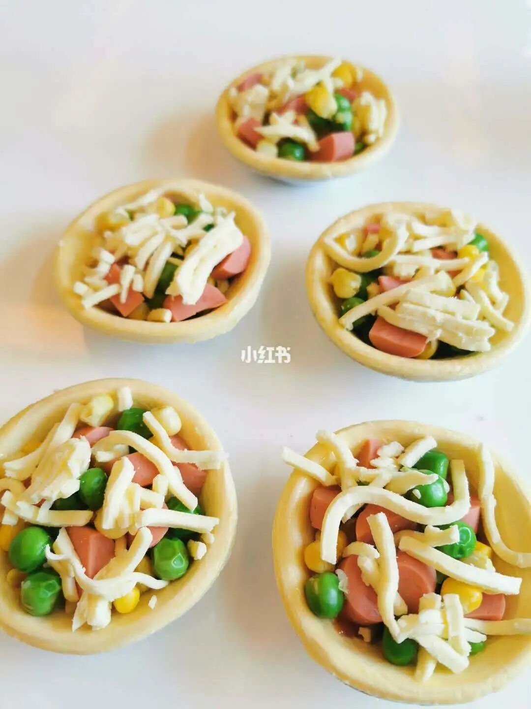玉米、青豆、香肠、蛋挞皮、番茄酱、芝士碎