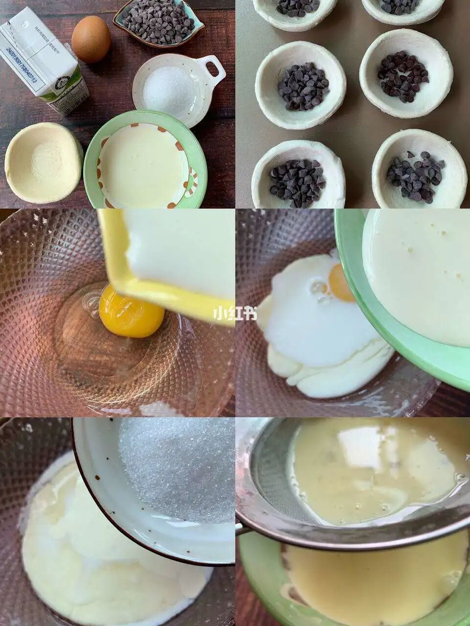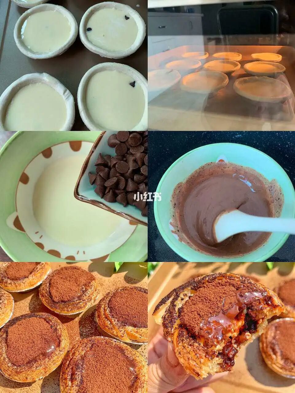 蛋挞皮6个、鸡蛋1个、淡奶油60g、牛奶50g、白糖10g、巧克力豆50g、可可粉少许