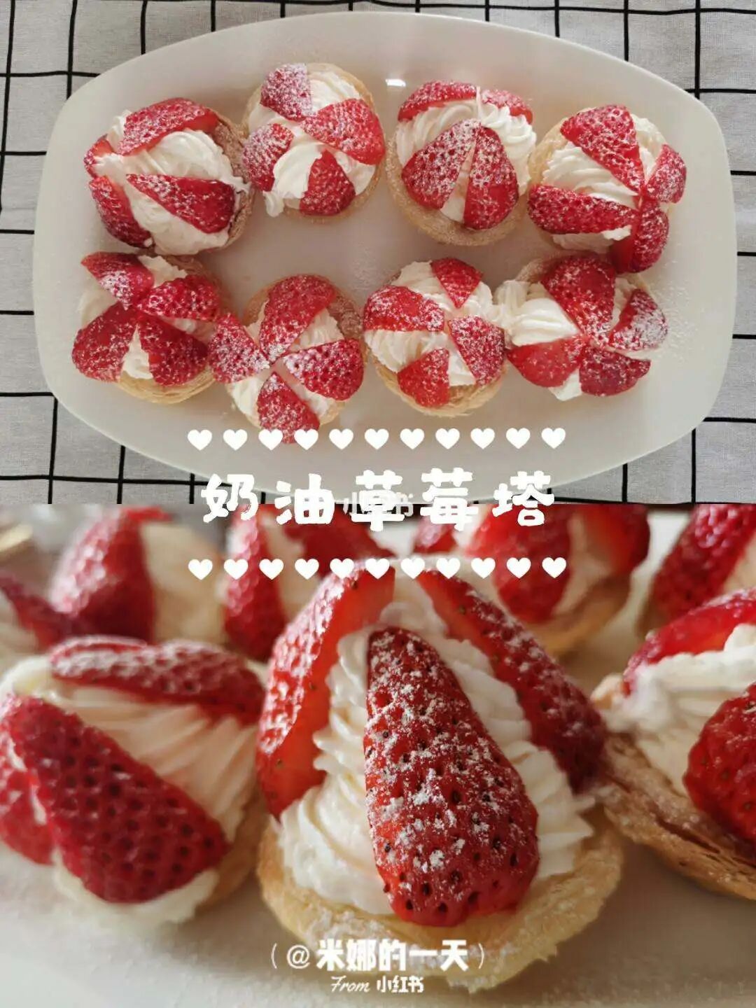 蛋挞皮8个、草莓8颗、淡奶油150ml、白糖10g、糖粉一丢丢