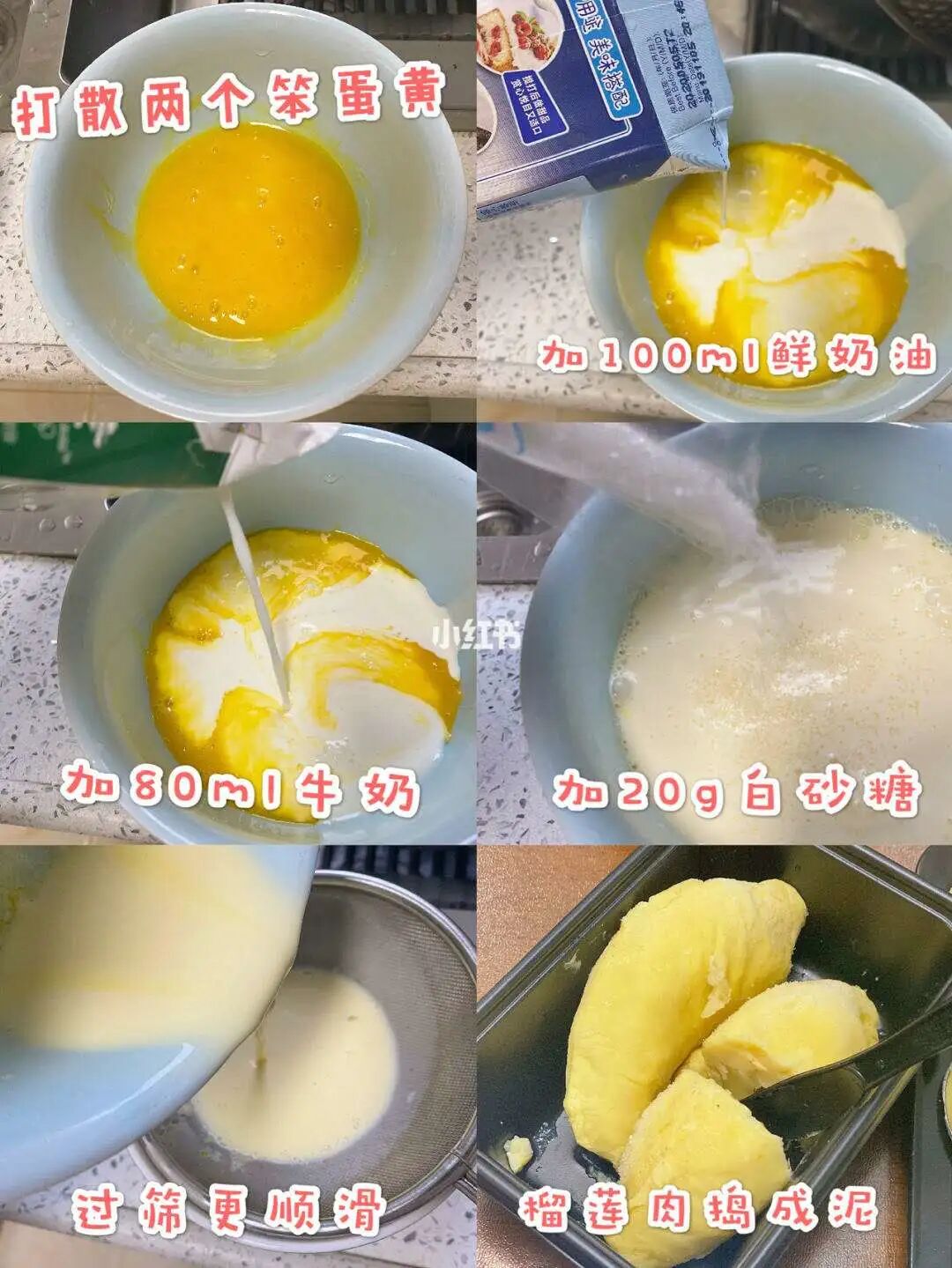 榴莲一块、棉花糖若干、鸡蛋两枚、鲜奶油100ml、牛奶80ml、蛋挞皮若干、白砂糖20g