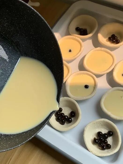 3.过滤好的蛋液倒入蛋挞皮中,8分满,放入预热好的烤箱200度烤20分钟。
