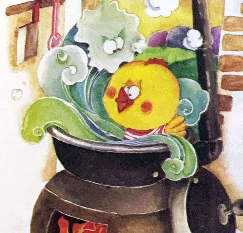 半只鸡终于来到了京城,他来到王宫,看到一个门,有许多人出出进进,“这是哪儿啊?”他问在墙角晒太阳的花猫,花猫告诉他,这是王宫的厨房那些人是国王的厨子。“厨子看来也没什么特别的!”于是半只鸡大模大样的朝那些人走了过去,这时走过来一个厨子,抓住半只鸡,随手把它扔进了开水锅里。