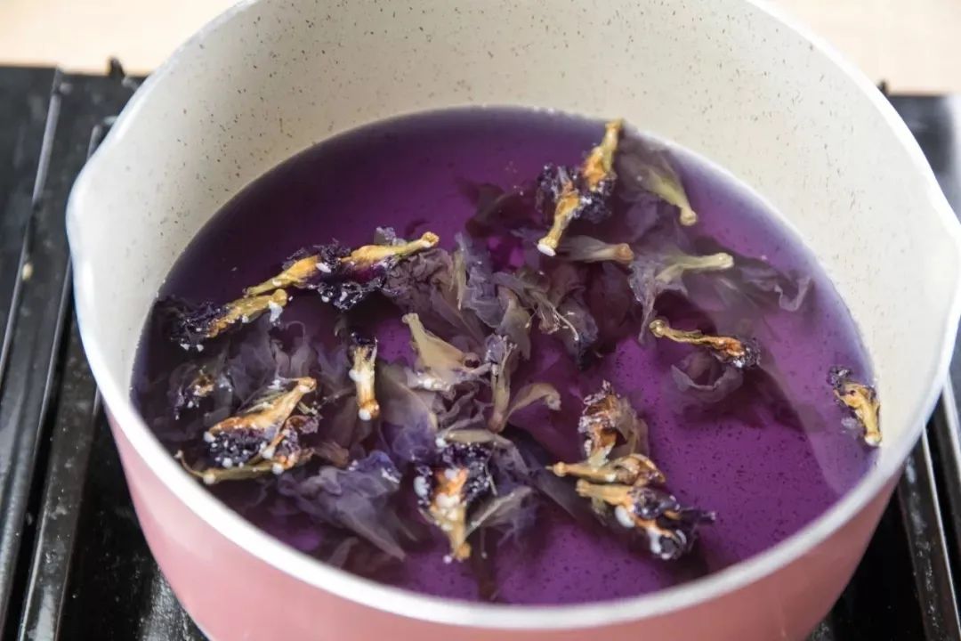 1、2g蝶豆花加入350g清水中,煮至沸腾变色。