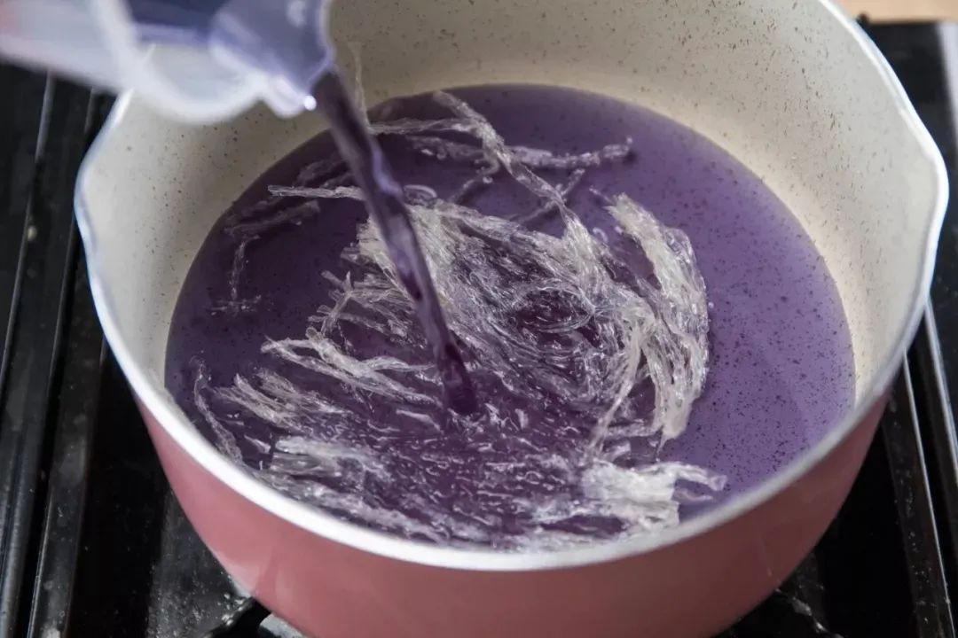 3、锅里放入蝶豆花水和10g琼脂,开小火煮5分钟左右,直到琼脂溶解就可以了。