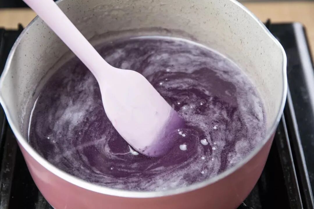 5、将蝶豆花糖浆熬成粘稠状,约10分钟左右。