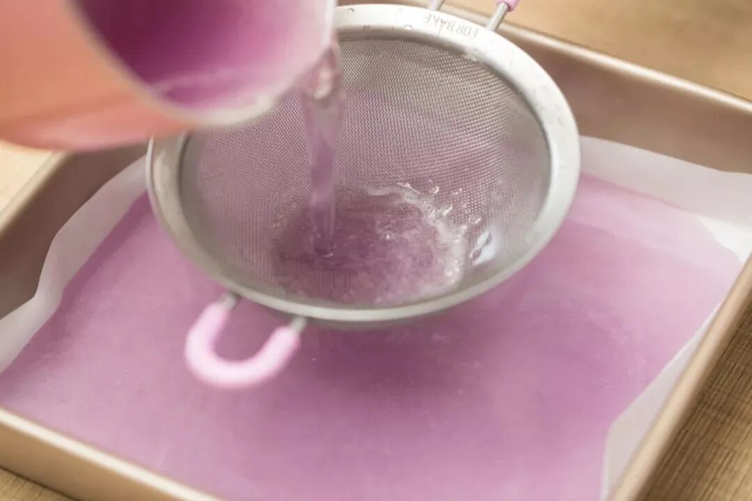6、煮好的糖浆过筛倒入提前垫有油纸的方形烤盘中,可以滤掉糖浆表面的泡沫。完全放凉后,送入冰箱冷藏至完全凝固,约2个小时左右。