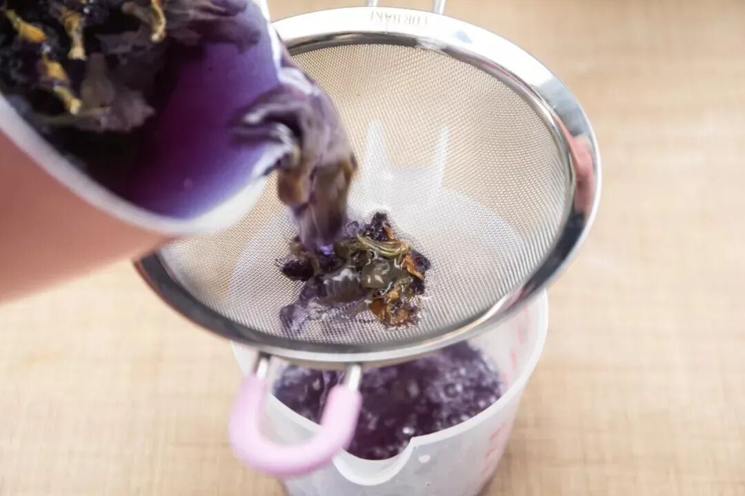 2、煮好的蝶豆花茶,过滤掉茶渣,留下蝶豆花水。