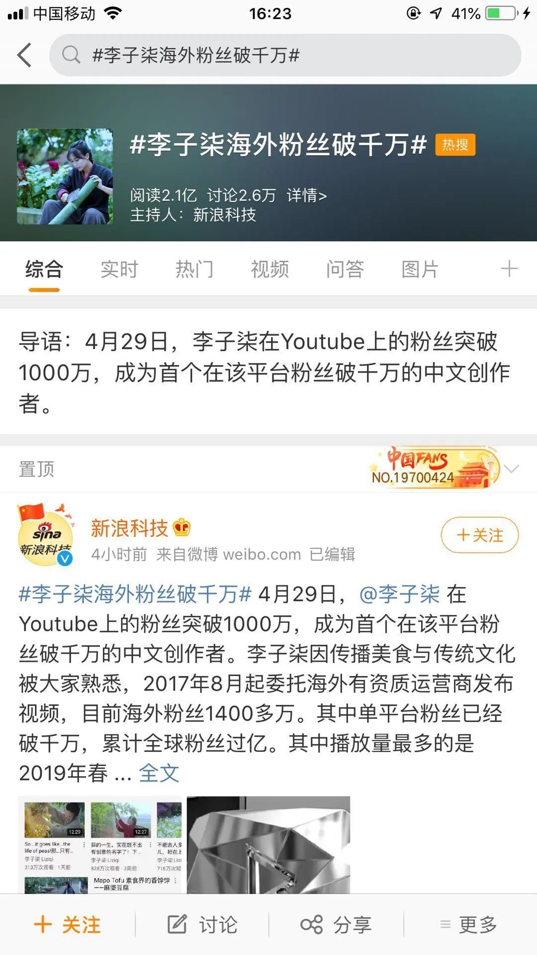 昨天下班前看到一个令人开心的热搜:李子柒的海外粉丝破千万了!!!