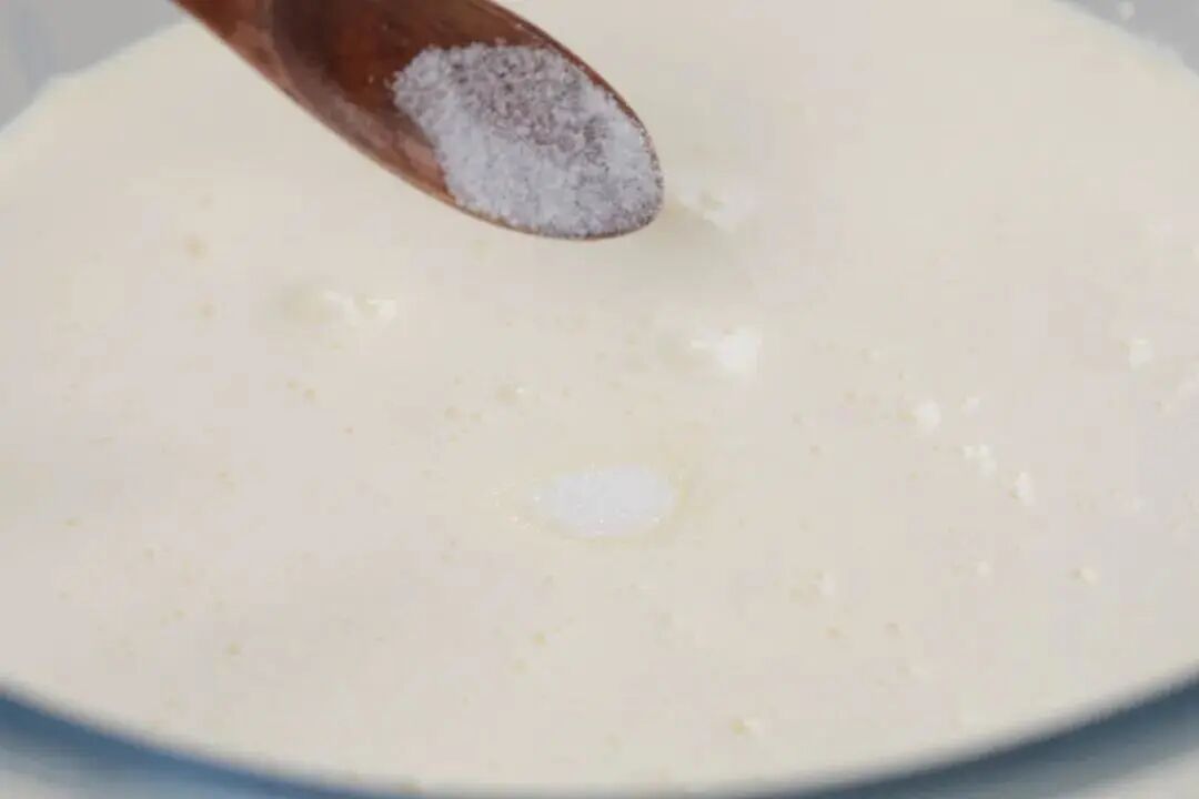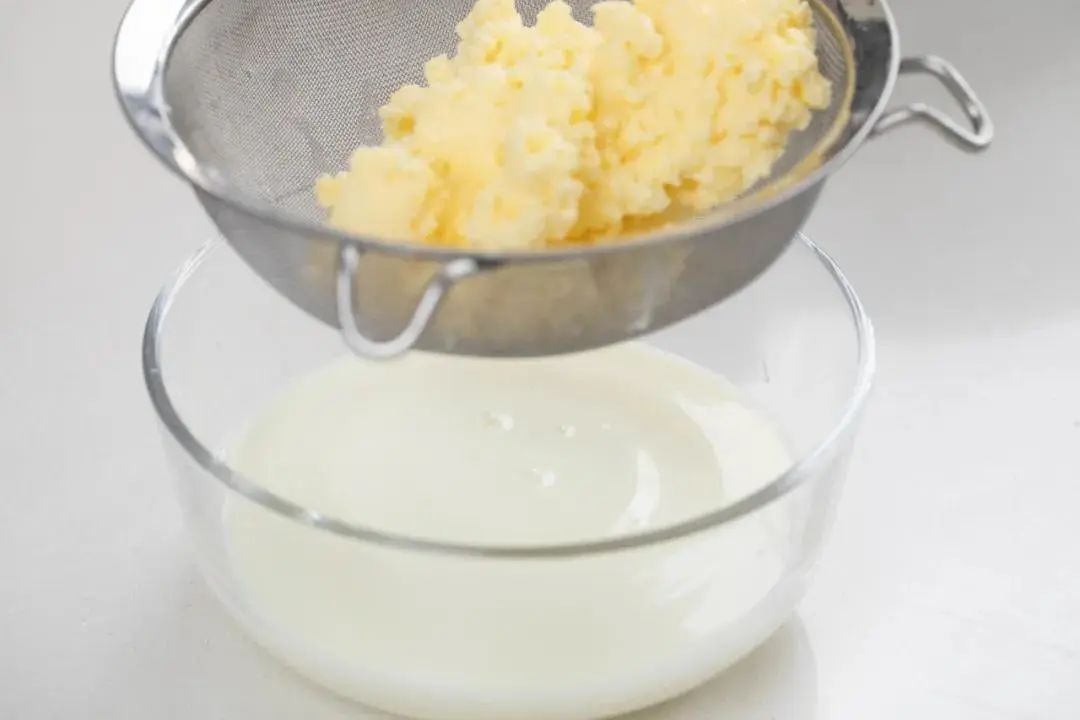 9. 用网筛捞出黄油,并滤掉多余水分,下面乳白色的就是白脱牛奶了。
