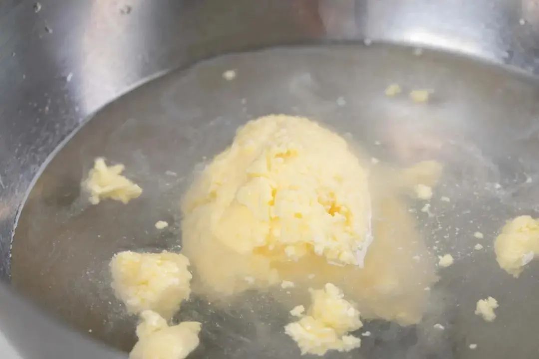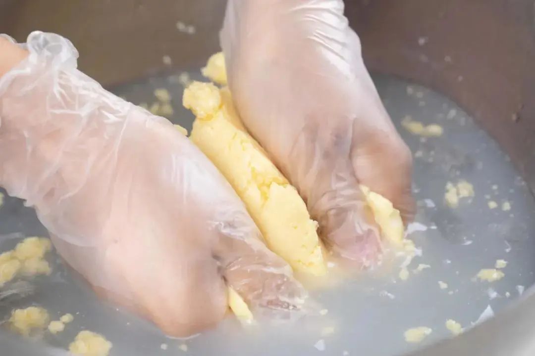 11. 不断揉搓黄油,黄油由于低温会进一步凝固成团,而水分达不到凝点就会通过挤压排出。
