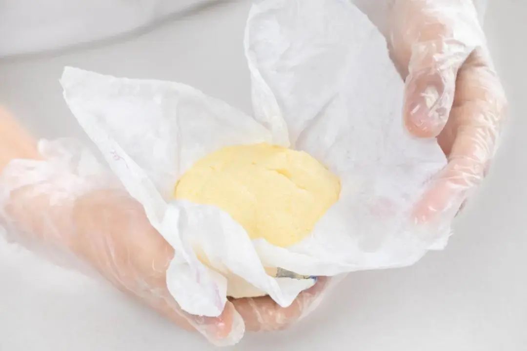 12. 把黄油揉成团取出,用厨房纸吸掉表面多余水分。