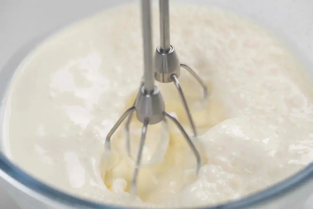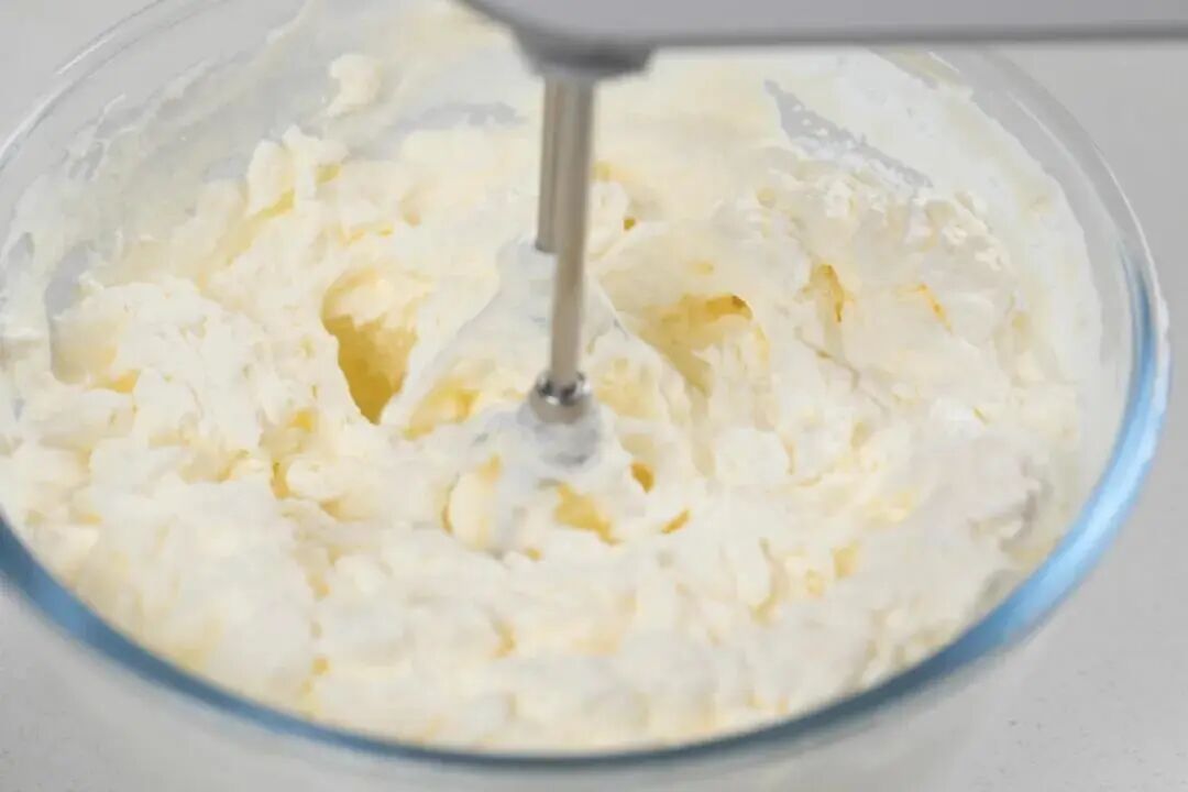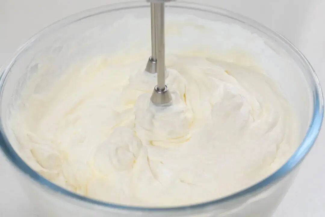 2.开电动打蛋器高速打发。一般我们打发淡奶油时会用低速,可以避免打发过度,但因为这里我就是需要彻底打发过度,所以直接开高速就行了。