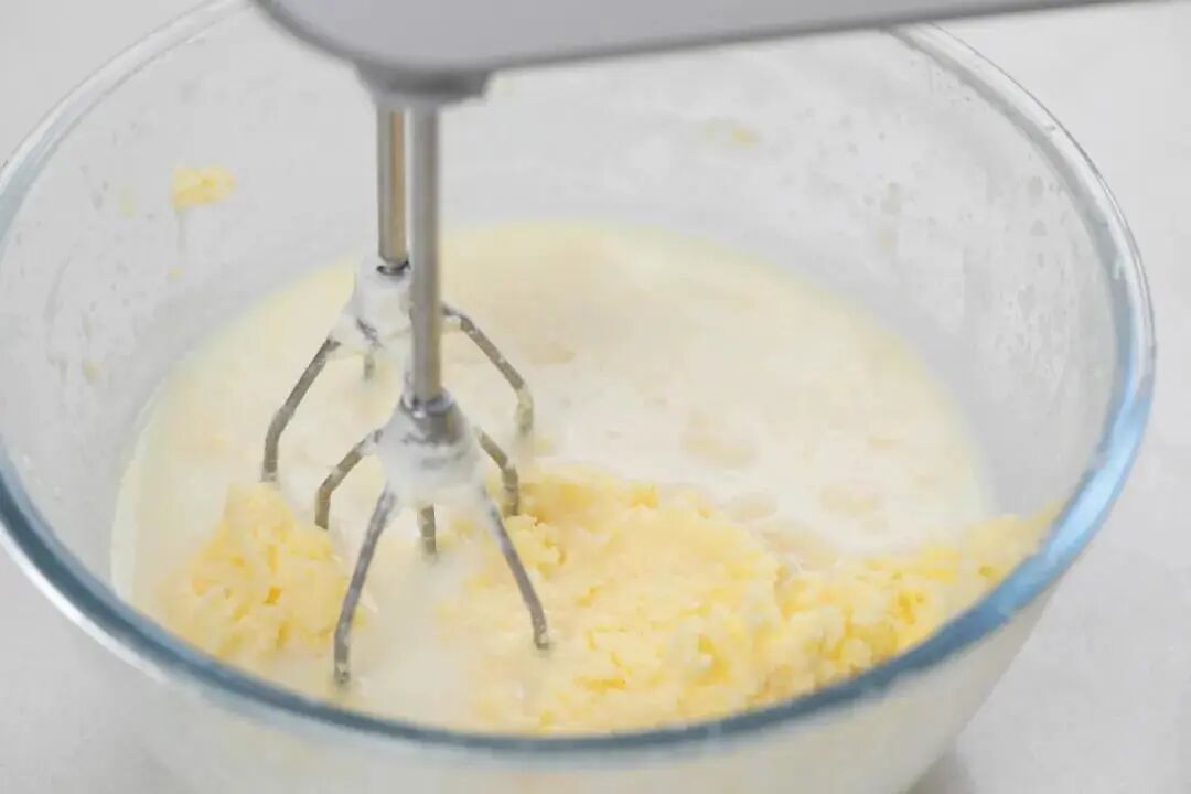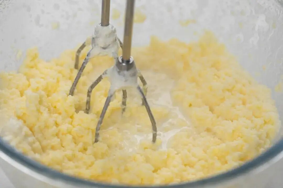 7.继续搅打黄油开始成团,底部出现牛奶。