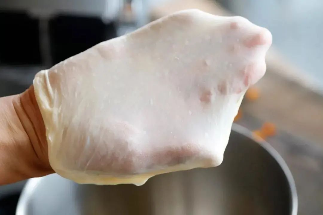 4. 把面团撑开成薄薄的膜,可以很好地套在手上,且不容易断裂,具有很好的延展性,透明度强,被称作为“手套膜”。如果将面团捅破,破洞边缘光滑。此为完全阶段,此状态可制作一般吐司