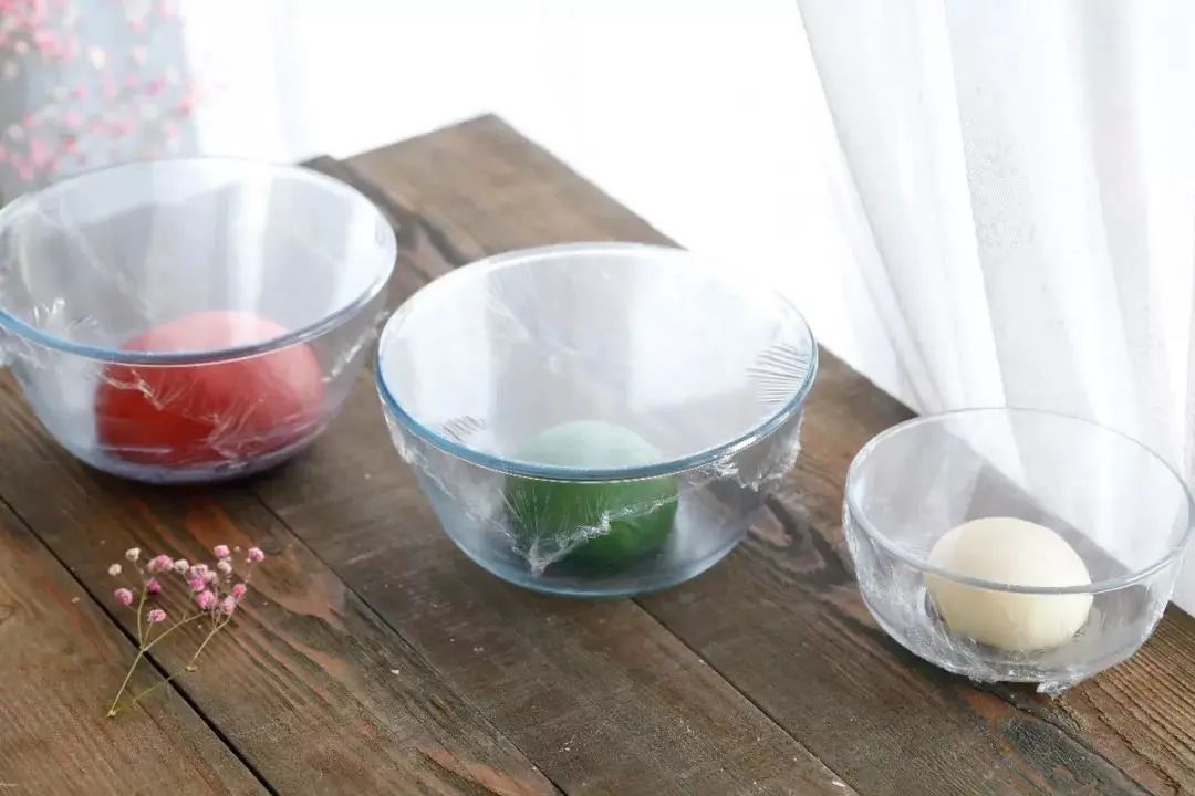 7.三份面团用保鲜膜盖好,放置于温暖处待发酵至两倍大。