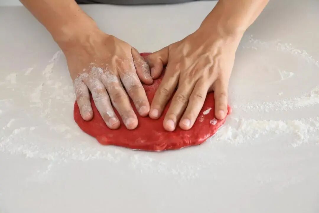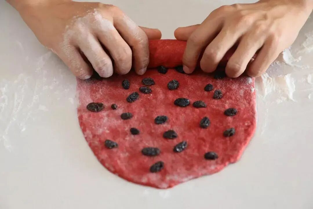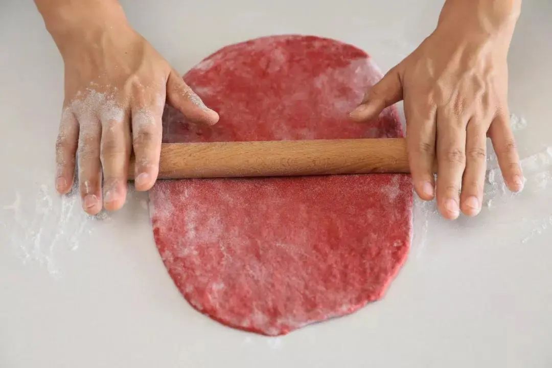 10. 将红色面团擀成宽度比模子长度略短的长方形。