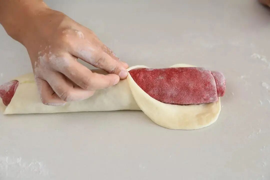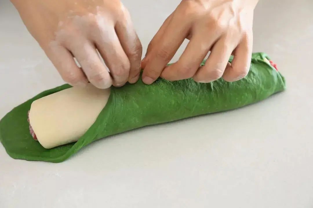 12. 像卷铺盖一样卷起来,收口处捏紧,卷的时候要卷紧,不然烤出来会空心的。
