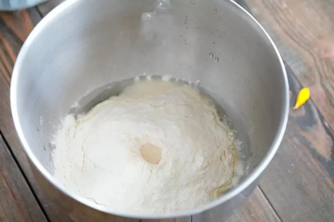 1.将牛奶135g、鸡蛋 1个、细砂糖35g、盐4g、高筋面粉270g放入厨师机桶中,在高筋面粉表面戳个洞,放入4g耐高糖干酵母,确保酵母和盐、糖不直接接触,否则容易失效。