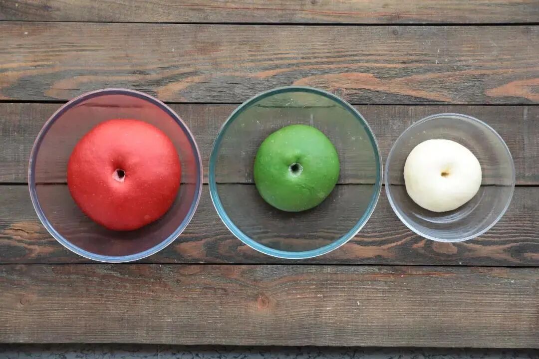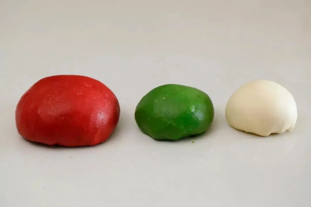 6.最大的面团揉入8g红曲粉,中间面团揉入6g的抹茶粉,最小那个面团不加其他材料。