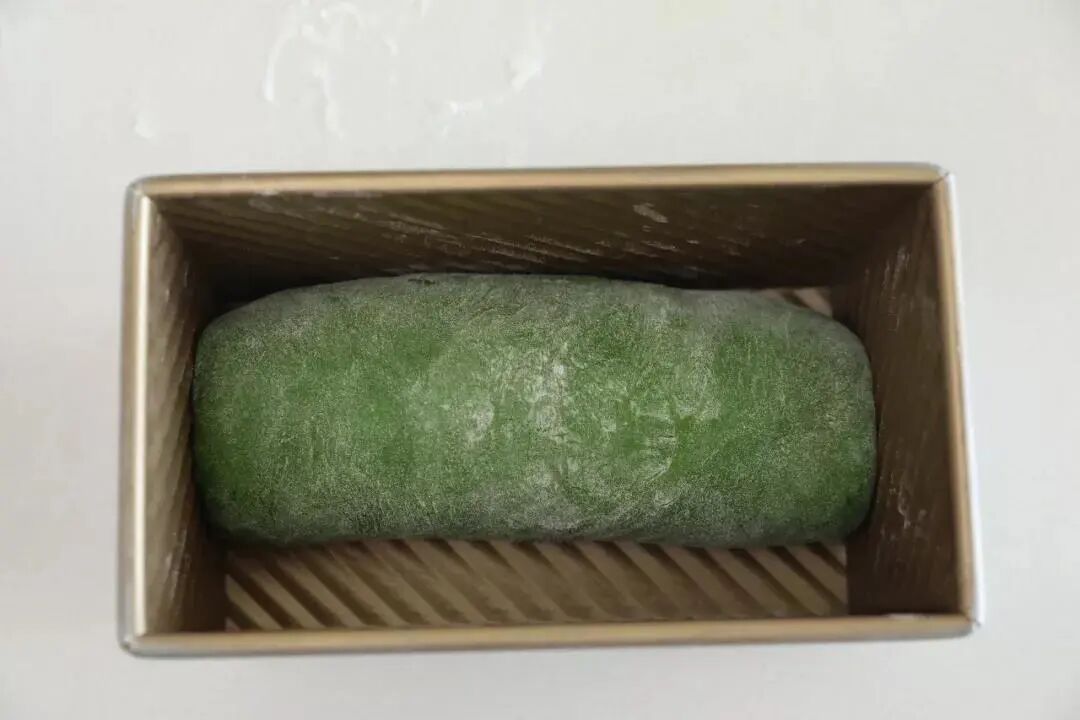 15.整理下两端,放入容量是450g的土司模具中,盖上保鲜膜。