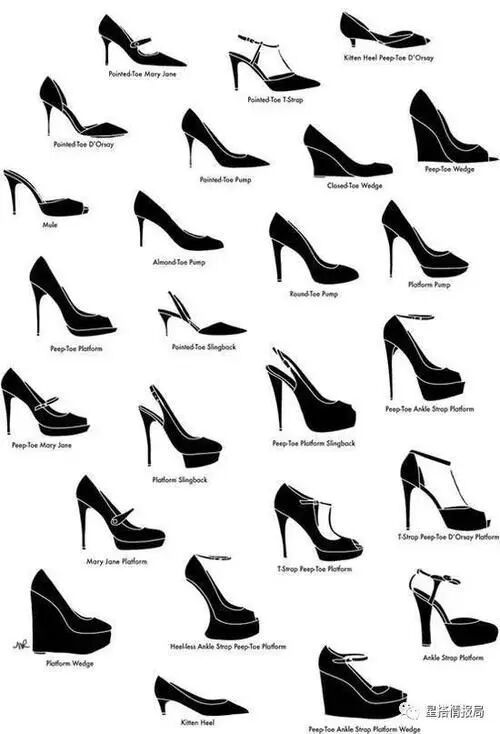 如果详细划分的话,高跟鞋就有这么多不同样式的鞋跟,在确定好适合的跟高高度时候也要选好跟高的款式。