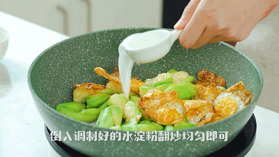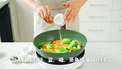 4. 往锅中倒入白胡椒粉、盐、糖、蒸鱼豉油翻炒均匀,再倒入调制好的水淀粉翻炒均匀即可