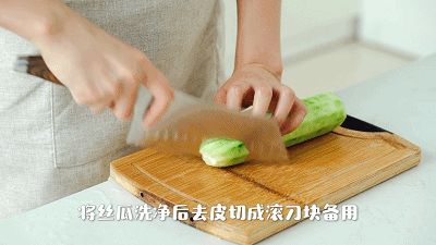 1. 将丝瓜洗净后去皮,切成滚刀块备用