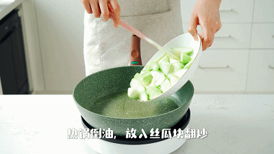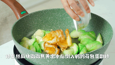 3. 热锅倒油,下丝瓜翻炒,待炒至丝瓜块微微焦黄出水后,倒入煎好的荷包蛋翻炒均匀